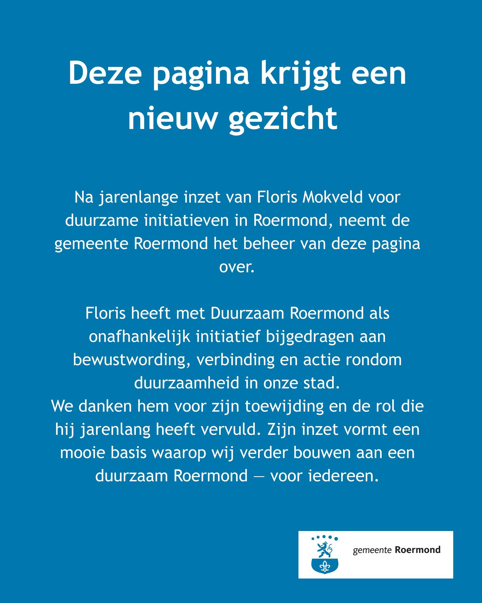 Na 15 jaar met heel veel plezier de webpagina van www.DuurzaamRoermond.nl te hebben gevuld met allerlei eigen ervaringen, ideeën en realisaties rond Duurzaamheid/Volhoudbaarheid neemt in 2025 de gemeente Roermond dit domein over. Mijn activiteiten gericht op de bewoners van Roermond komen daarmee tot een einde. Dank voor het lezen!